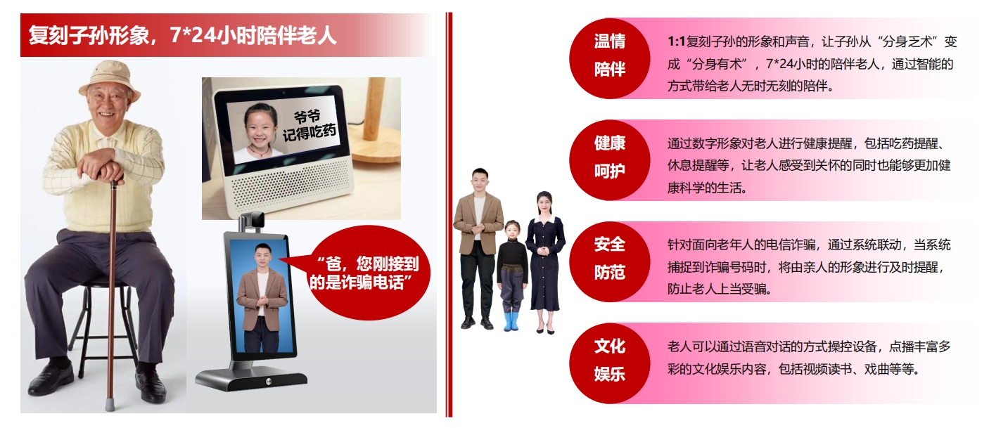 1.以子孫形象陪伴老人,信息化方式呵護老人。復刻子孫形象聲音,以親切的方式陪伴老人,并提供健康、安全、文化娛樂等豐富服務,通過智慧化的方式呵護老人,幫助老年人跨越數字鴻溝,安享晚年生活。